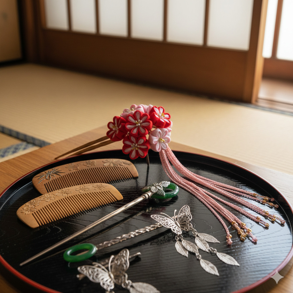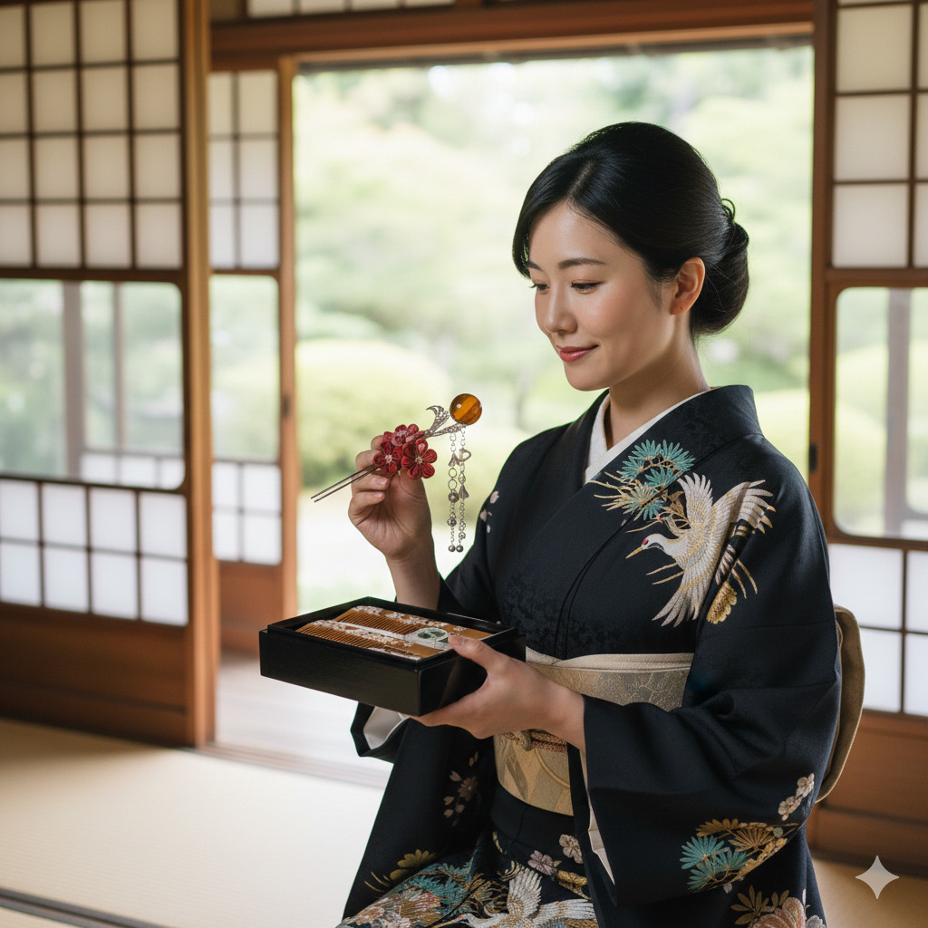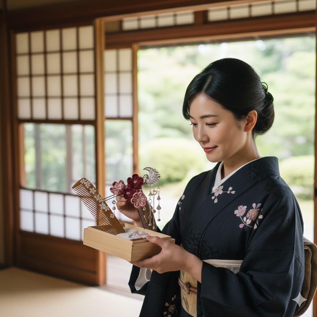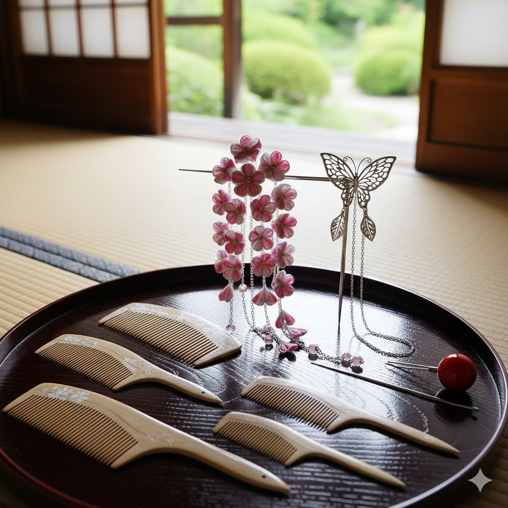 和装の際には、つげ櫛で髪を整え、簪で華やかに飾ることで、伝統的なスタイルを楽しむことができます。
